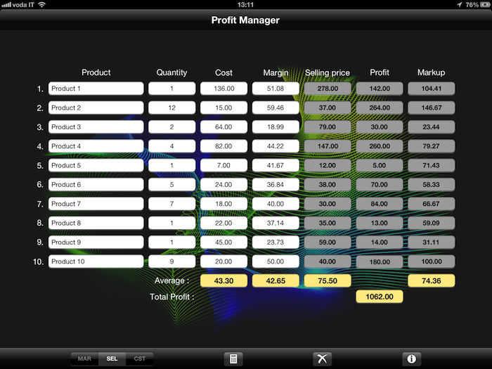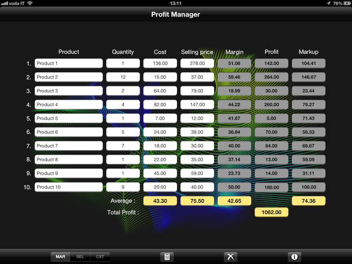 - use the infos button to access all the formulas to do the math, and a Margin/Markup correspondence table.